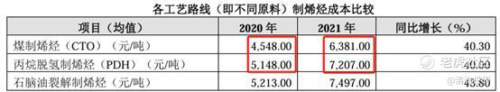 据宝丰能源财报披露,2020年,煤制烯烃成本4548元/吨,而丙烷脱氢成本5148元/吨。2021年,能源价格大涨,各工艺制烯烃成本也均有所增加。但不变的是,丙烷脱氢成本仍高于煤制烯烃。