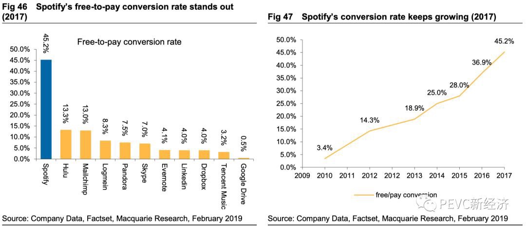 Spotify在用户付费转化率方面一枝独秀,付费率高达45.2%,远高于Hulu、Pandora、Evernote、腾讯音乐等Freemium模式平台10%左右的转化率。