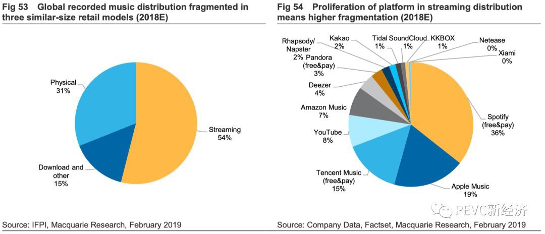 2018年全球五大流媒体音乐分销商分别为Spotify(36%)、Apple Music(19%)、腾讯音乐(15%)、Youtube(8%)和亚马逊音乐(7%),合计占据了全球85%市场份额。