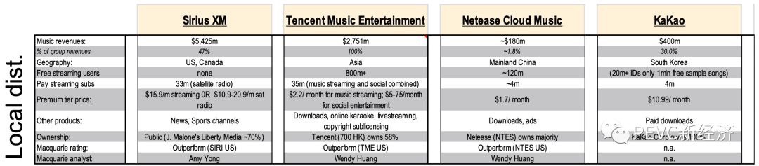 区域分销商包括Sirius(北美)、腾讯音乐(中国)、网易云音乐(中国)和Kakao(韩国)等;四家的对应收入分别为54.25亿美元、27.51亿美元、1.8亿美元和4亿美元;付费用户分别为3300万、3500万、4百万和4百万。Sirius和Kakao的订阅费分别达到15.9美元/月和10.99美元/月;相比之下腾讯音乐和网易云音乐的定价较低,分别为2.2美元/月和1.7美元/月。不过腾讯音乐的社交娱乐用户收入贡献更高,达到5~75美元/月。