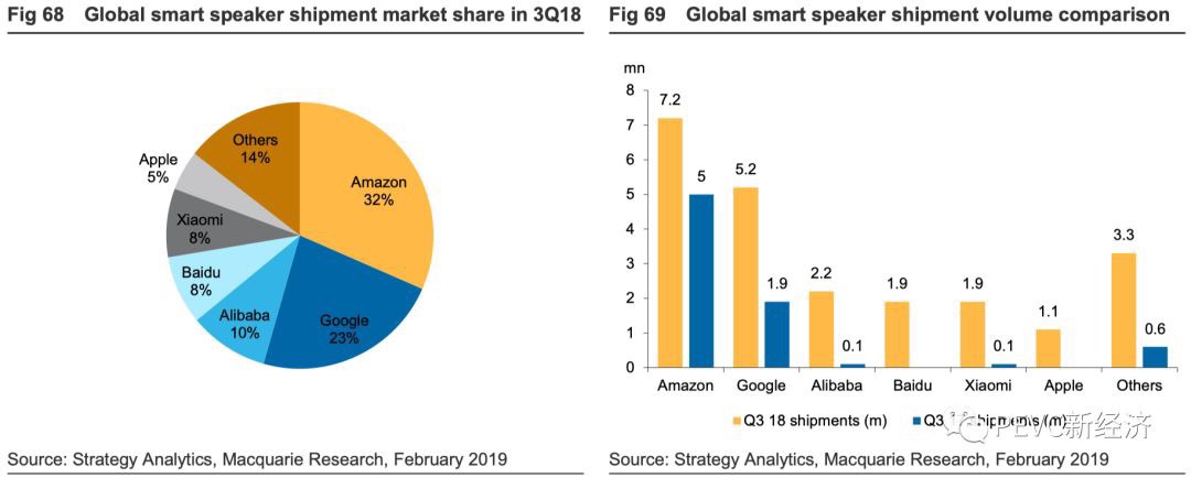中国的阿里巴巴、百度和小米则是中国的领导者,合计占据28%全球出货量份额,2018年3季度出货量分别为220万台、190万台和190万台。