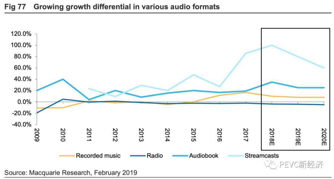 从增长速度来看,电台在2013年后连续出现市场萎缩;而唱片音乐在2015年后连续出现温和增长;有声书和流媒体播客则持续保持高速增长。
