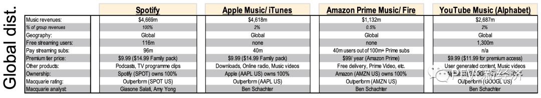 全球分销商主要包括Spotify、Apple Music、亚马逊Prime Music和Youtube Music。这四家的音频收入分别为46.69亿美元、46.18亿美元、11.32亿美元和26.87亿美元;分别拥有9600万、4000万、4000万和n.a.付费用户。订阅费用均在9.9美元/月到99美元/年左右。