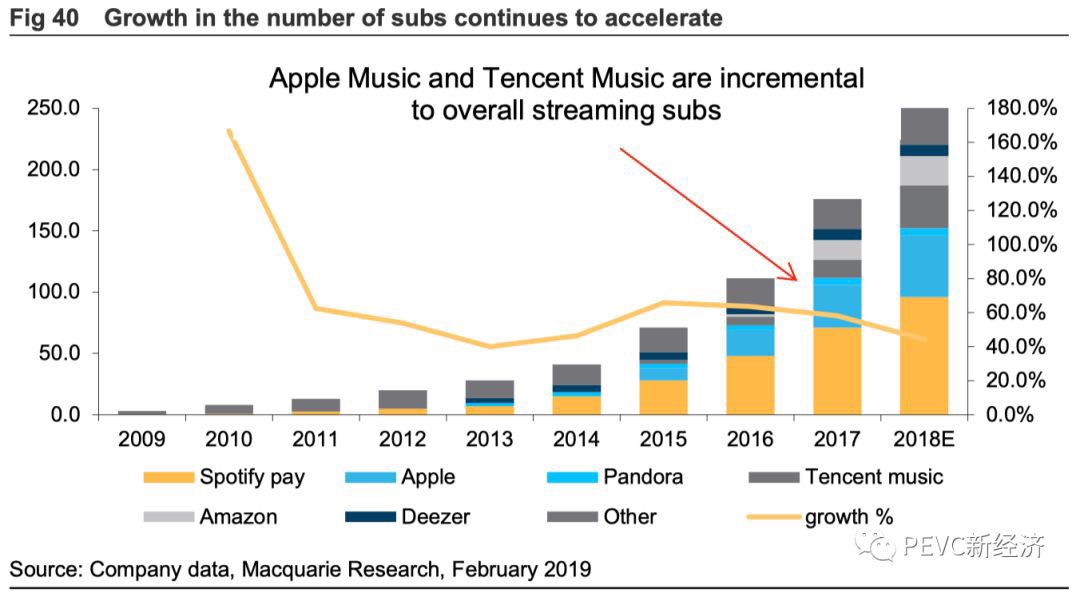 全球付费音频订阅用户在2018年首次突破2亿并接近2.5亿,同比增长40%。其中Spotify和Pandora的付费订阅用户占全球一半以上;腾讯音乐和Apple Music增长则高于行业水平。