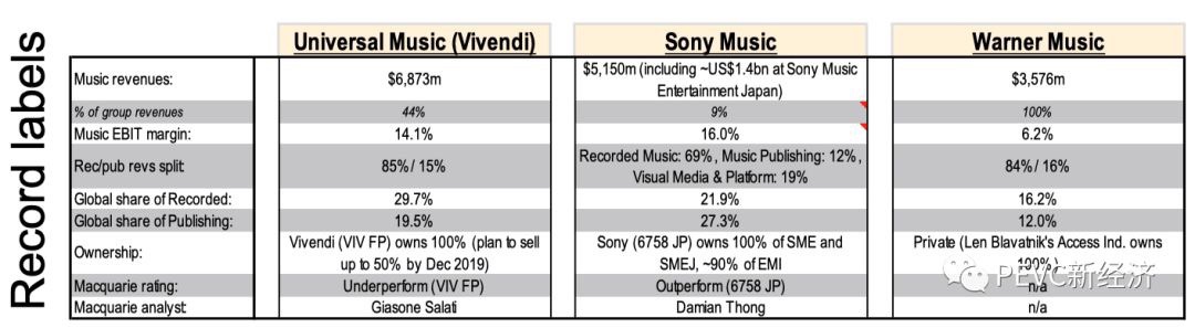 三大唱片公司环球音乐、索尼音乐和华纳音乐控制着全球音乐版权话语权。环球、索尼、华纳三大唱片公司的2018年收入分别达到68.73亿美元、51.50亿美元和35.76亿美元;占全球唱片业收入的比例分别高达29.7%、21.9%和16.2%。