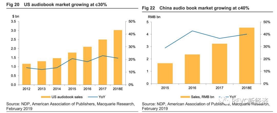 中国2018年的有声书市场规模则为40亿人民币左右,增长率约为40%。喜马拉雅FM是中国有声书行业最大的综合平台(有声书+流媒体播客),拥有超过3.3亿移动端用户,2018年收入约为3亿美元,其中50%的收入来自会员订阅,其余收入来自于广告和硬件。2019年2月,腾讯音乐、高盛和泛大西洋投资向喜马拉雅投资40亿人民币,公司估值约为34亿美元;喜马拉雅预计在2019年下半年上市。