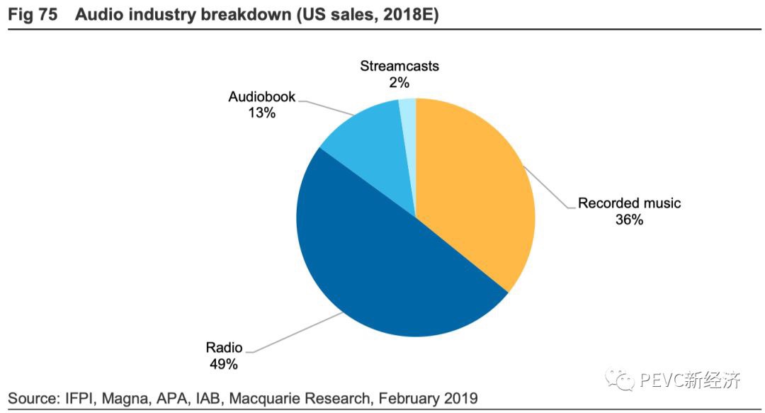 尽管唱片音乐对于音频娱乐行业,就如同电影对于视频娱乐行业一样在聚光灯的中央。不过实际唱片音乐的收入仅占全球收入36%,而电台仍然占据49%的份额,此外近年来有声书市场也在不断扩大,收入占比达到13%。流媒体播客的商业化探索仍然在早期,收入占比仅为2%。