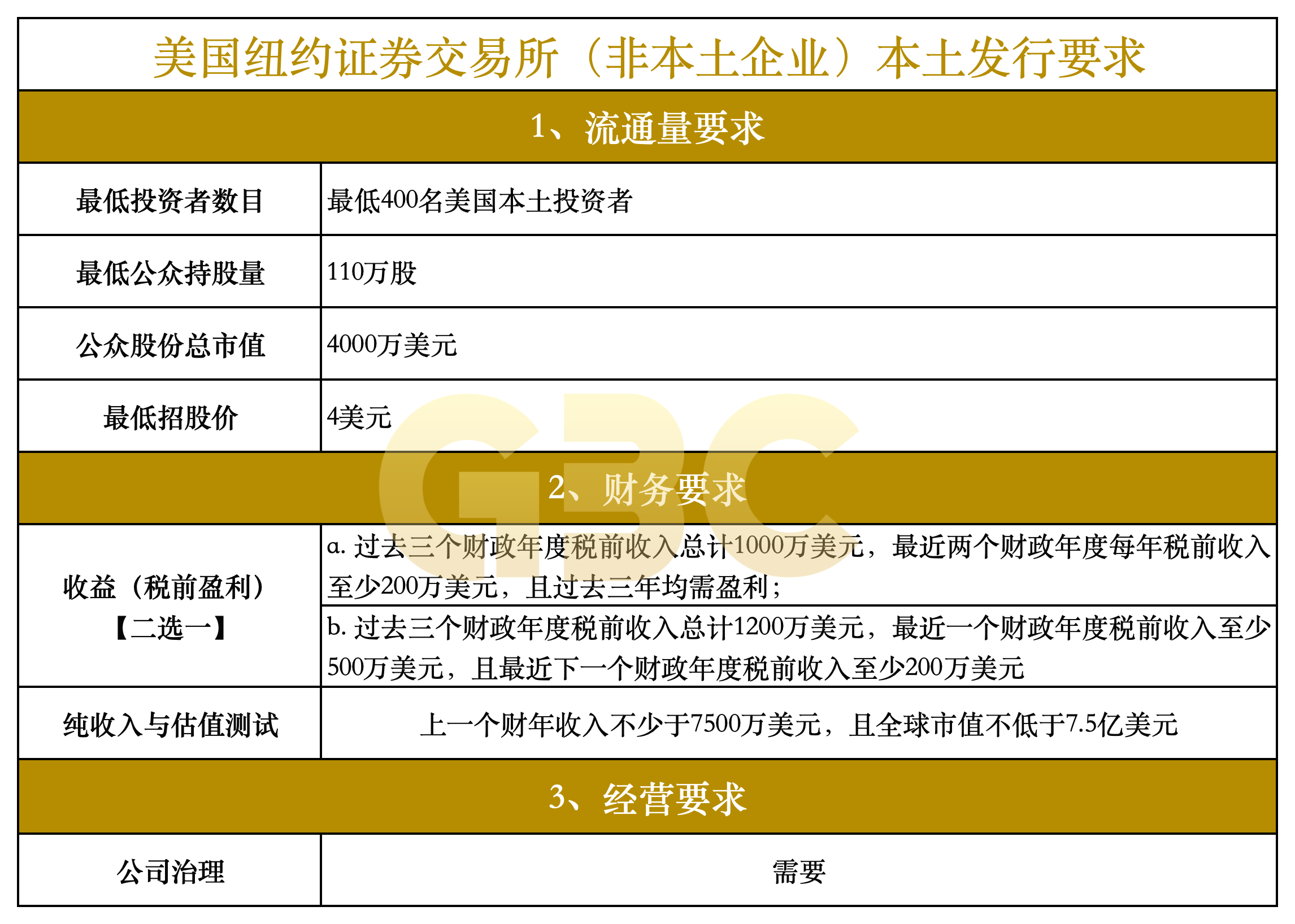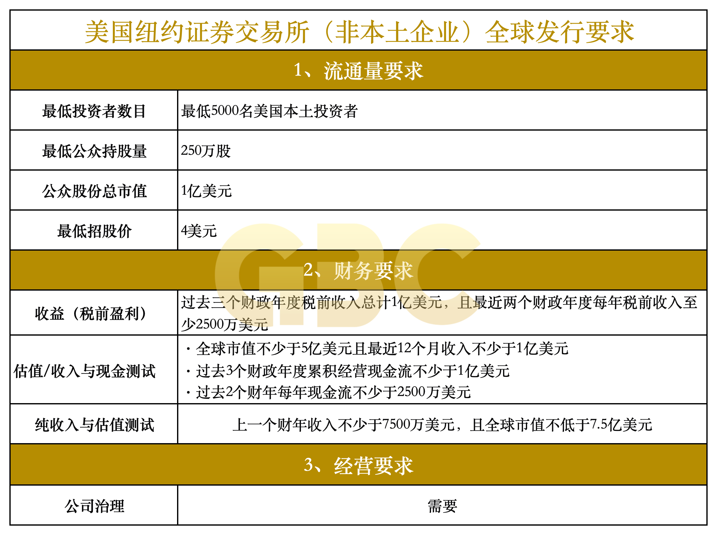 纽约证券交易所对上市公司设有一系列严格的发行条件,以确保市场的稳定性和投资者的利益。对于非美国本土企业,纽交所提供了两套上市标准:本土发行标准和全球发行标准,其中全球发行标准更为严格。