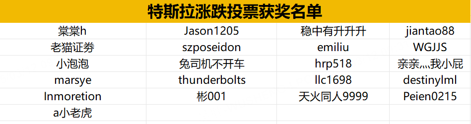 昨晚 $特斯拉(TSLA)$ 涨3.79%,恭喜以下21位虎友押注成功,一起瓜分500虎币,每人获得24枚虎币,恭喜大家!