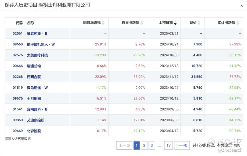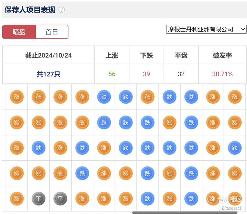摩根士丹利历史上作为保荐人参与了127个项目,其中暗盘有56家公司上涨,39家公司下跌,破发率30.71%。