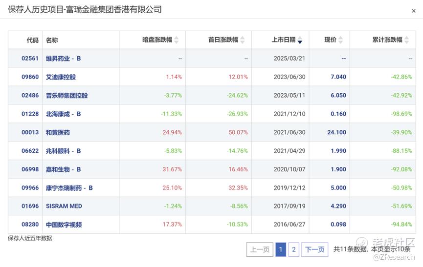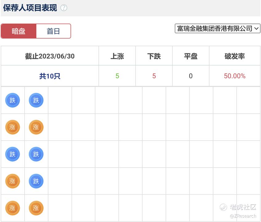 富瑞金融历史上作为保荐人参与了10个项目,其中暗盘有5家公司上涨,5家公司下跌,破发率50%。