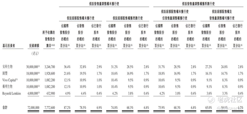 此次发行共引入5名基石投资者,分别为安科生物(香港)有限公司、药明生物旗下的WuXi Biologics HealthCare Venture、苏州工业园区旗下的园丰国际有限公司、多基金投资平台Vivo Capital和投资机构The Reynold Lemkins Group (Asia) Limited,共认购0.72亿美元,占全球发售股份的78.5%,及全球发售完成后已发行股本总数的6.9%(假设超额配售权及发行量调整权未获行使,按发售价71.86港元计算)。