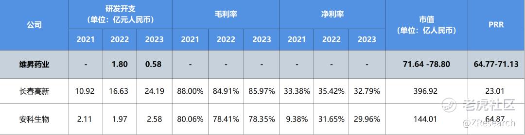 由于维升药业尚未实现产品商业化,缺乏经营性收入与利润,传统PE/PEG估值法不适用。基于生物科技公司研发阶段特性,我们采用市研率(PRR)进行估值,并选取生长激素领域可比上市公司长春高新及安科生物作为横向参照。维升药业近两年的平均研发开支为1.19亿元,按照发行价计算的市值为76.96 -84.65亿港元,对应的市研率(PRR)为64.77x-71.13x。公司当前估值处于中高位的区间,与安科生物相当,反映市场对其核心产品隆培促生长素(LAGH)商业化潜力的溢价预期。