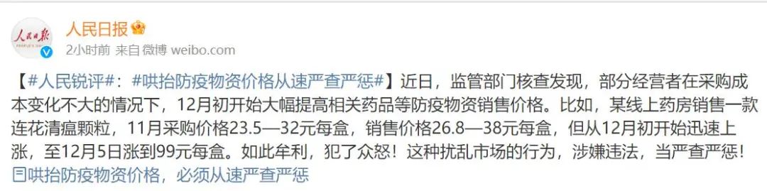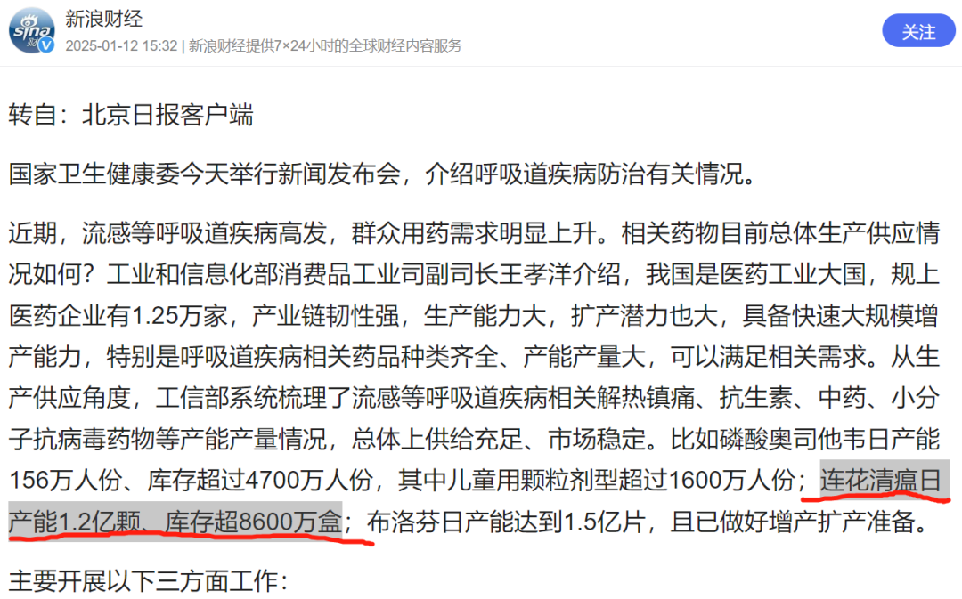 6、市场上并不缺少连花清瘟,甚至存货量也较充足。据1月12日国家卫健委发布的信息,目前我国连花清瘟的日产能达到1.2亿颗,库存超过8600万盒。