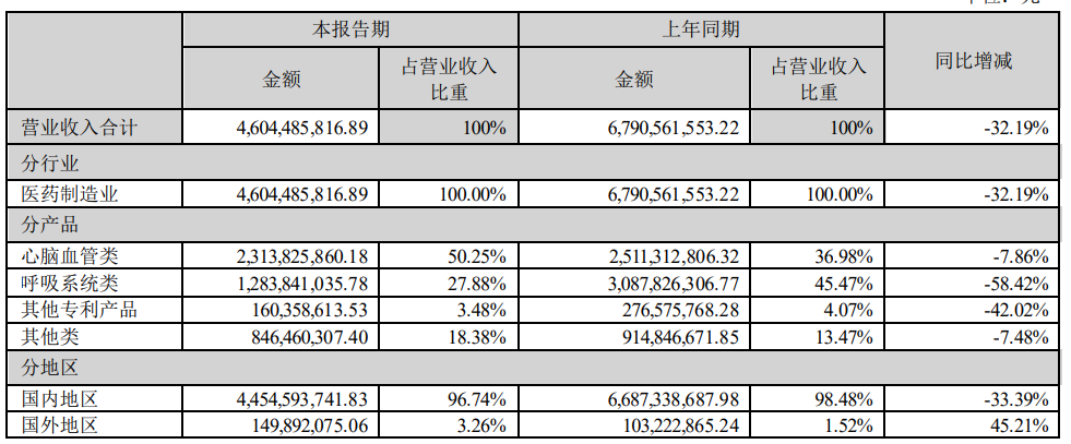 2024年后,以岭药业的情况也没有好转。2024年半年报显示,去年上半年,公司呼吸系统类产品的营收为12.84亿元,同比下降58.42%,营收占比也降到了27.88%。