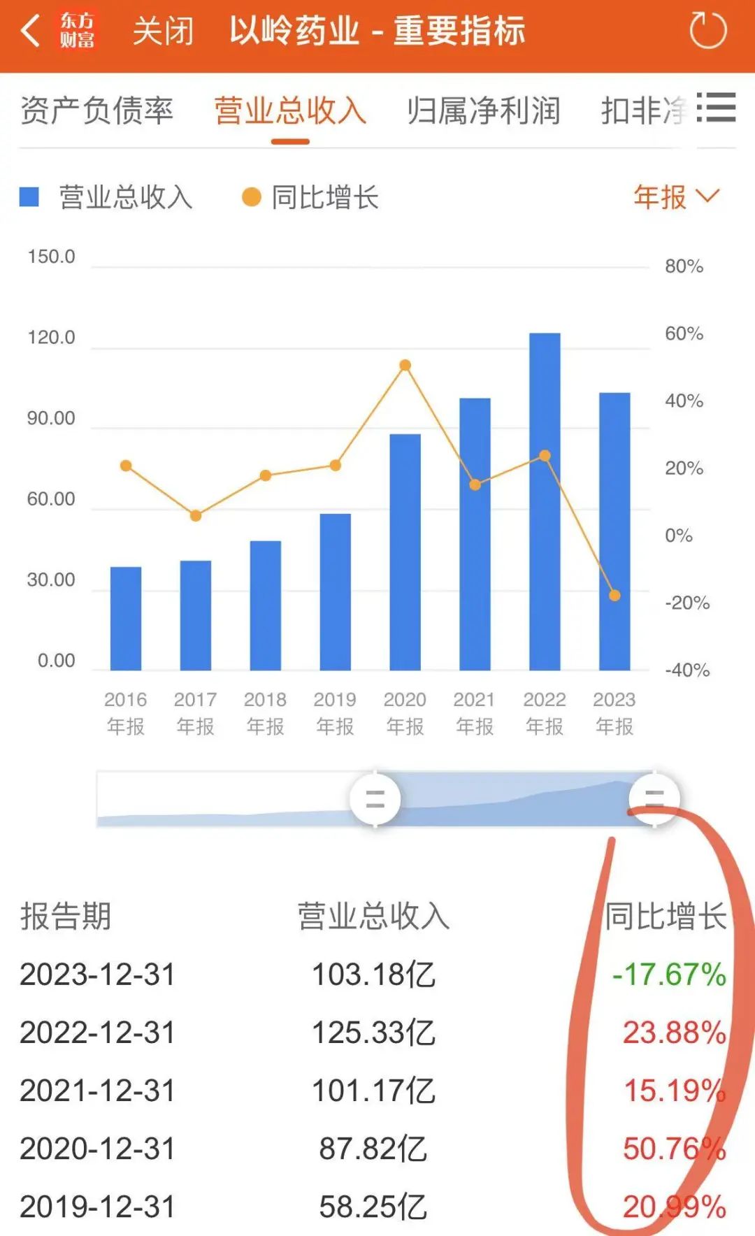 2023年,以岭药业实现营业收入103.18元,同比下降17.67%;实现归母净利润13.52亿元,同比下降42.76%。