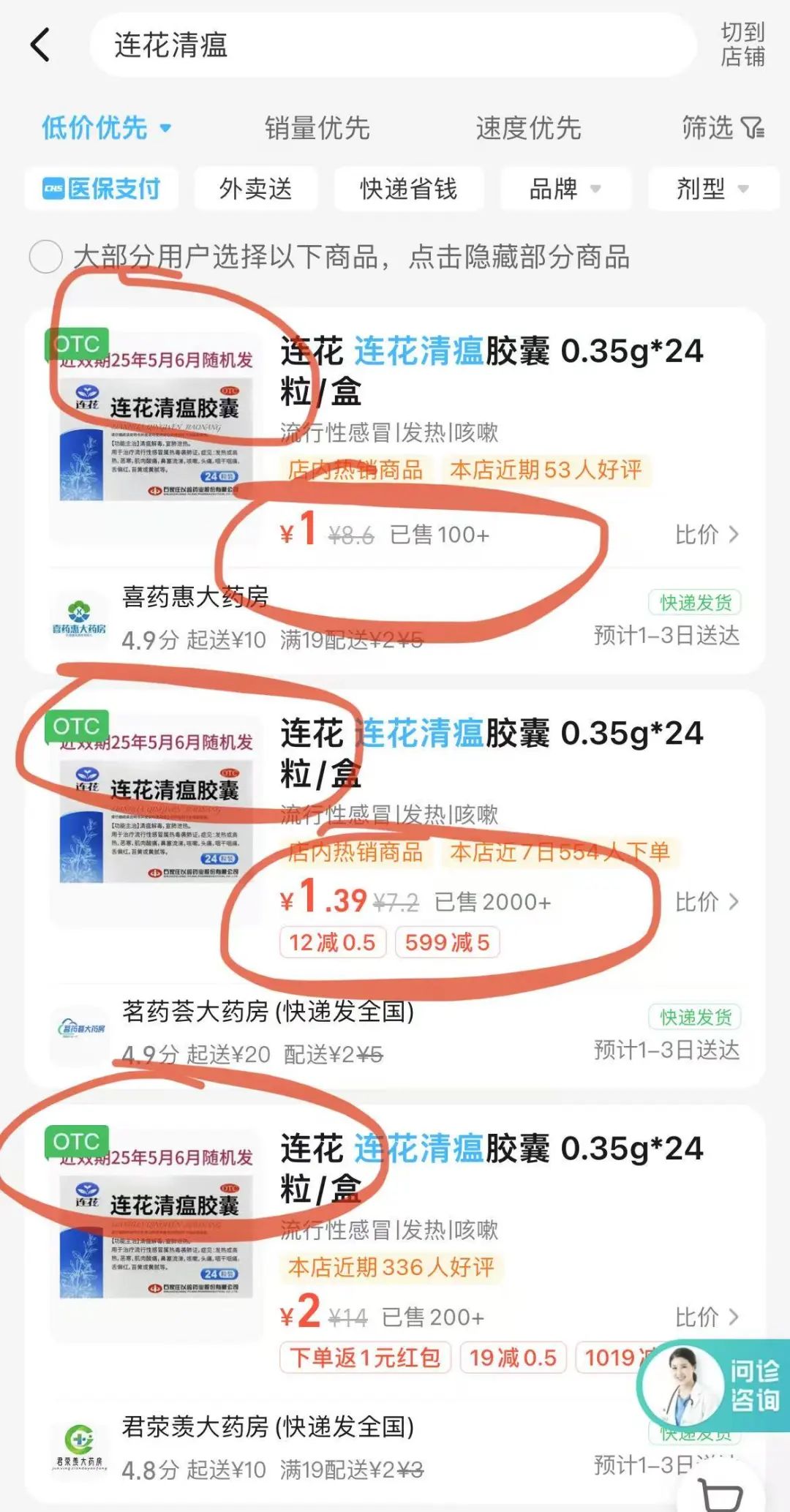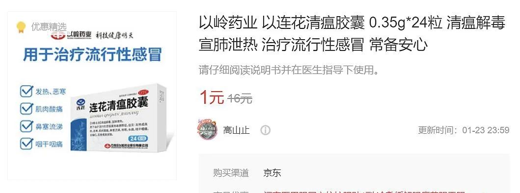 好奇的蔚来君,还是没忍住去电商平台看了看,然后还真就看到了1元的连花清瘟胶囊。