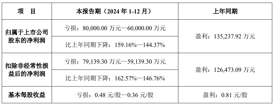 公司预计,2024年净利润亏损6亿—8亿元,上年同期盈利13.52亿元,比上年同期下降144.37%—159.16%;扣非净利润亏损约5.91亿元至7.91亿元,比上年同期下降146.76%—162.57%。