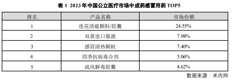 2023年中国公立医疗市场中成药感冒用药中,连花清瘟排第一位。