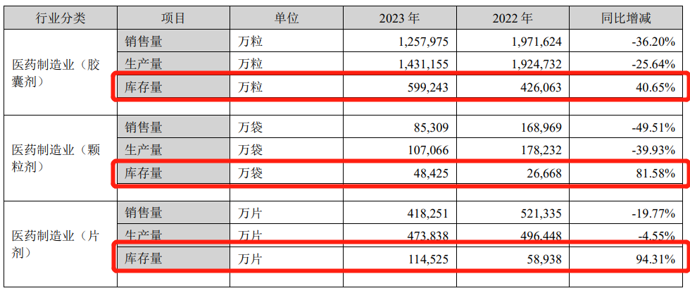 根据2023年年报,彼时,公司的医药制造业(胶囊剂)库存量约为59.92亿粒,同比增加40.65%;医药制造业(颗粒剂)库存量约为4.84亿袋,同比增加81.58%;医药制造业(片剂)库存量约为11.45亿片,同比增加94.31%。