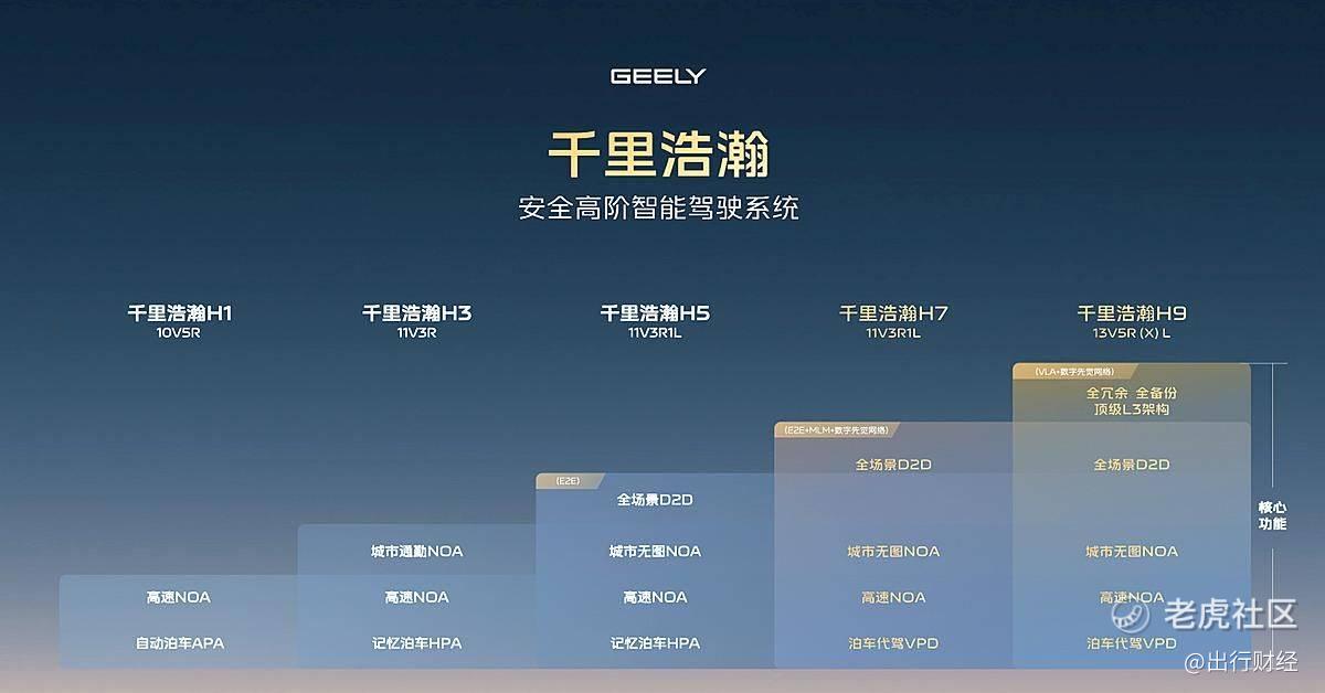其次,作为吉利在智能驾驶领域的重要创新,千里浩瀚智驾系统拥有独特的智驾体系架构,涵盖了从高阶驾驶辅助到高阶自动驾驶的全场景、全层级能力。千里浩瀚共分为五个等级,分别为“H1”、“H3”、“H5”、“H7”和“H9”,数字逐级递增,智能化水平亦逐步提升。