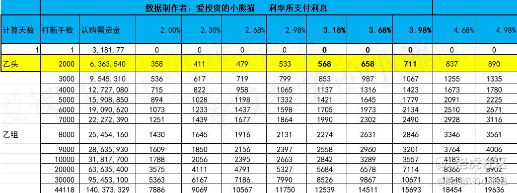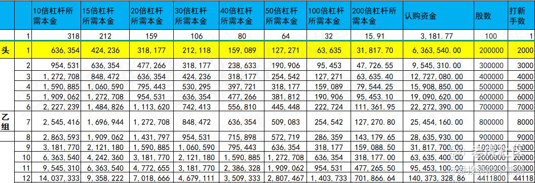 乙头需要认购资金637万,乙组的各档融资所需要的本金还有融资金额对应如下表: