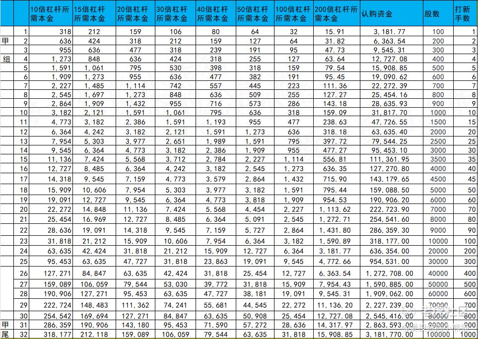 甲组的各档融资所需要的本金还有融资金额对应如下表: