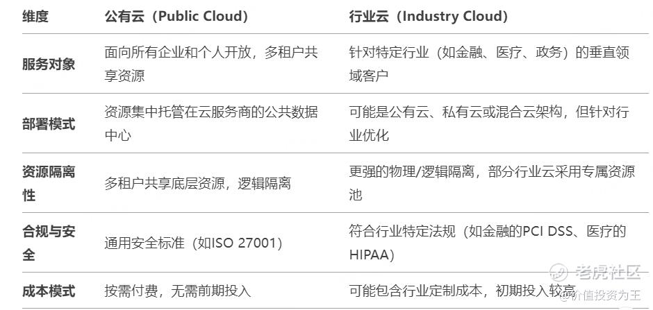 公共云和行业云都是云服务,只不过在目标客户、定制化程度上略有不同,公有云更像是“标准化超市”,行业云则是“专业定制店”: