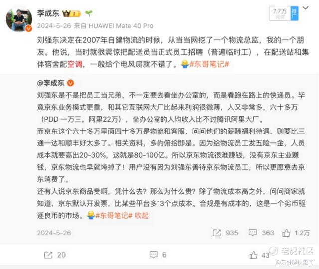 刘强东决定在2007年自建物流的时候,从当当网挖了一个物流总监,也是我很好的一个朋友。他曾经向我交流过帮助建立早期物流体系的时候,朋友很震惊刘强东要把配送员当正式员工招聘,普遍临时工,在配送站和集体宿舍配空调,一般给个电风扇就不错了。