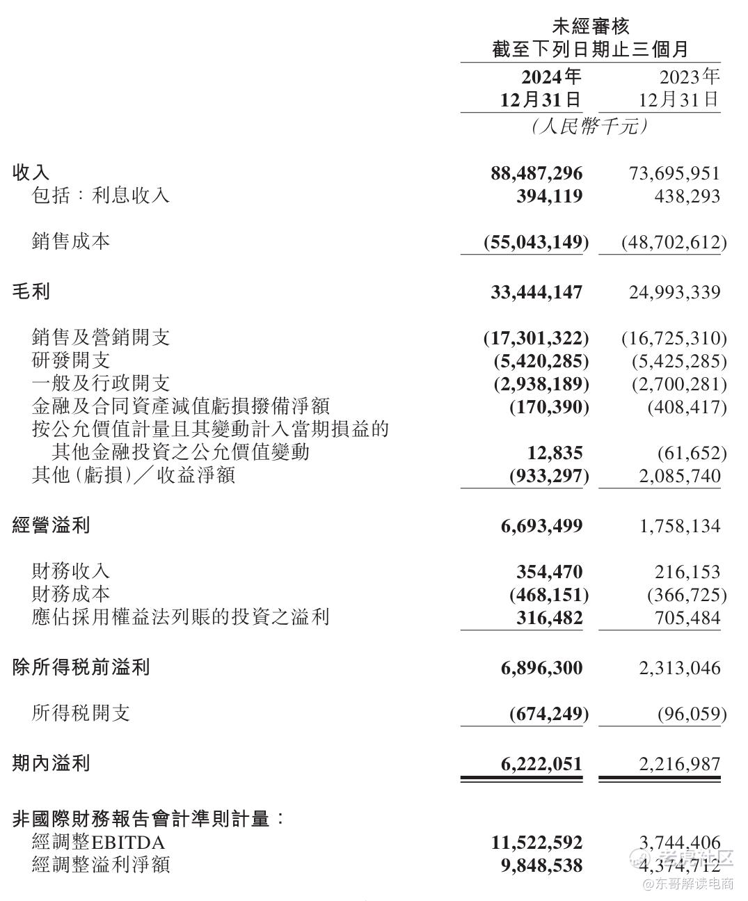 销售成本2,078.1亿元,占收入61.6%,占比同比下降3.3个百分点。销售及营销开支639.8亿元,占收入19.0%,占比同比下降2.2个百分点。 研发开支210.5亿元,占收入6.2%,占比同比下降1.5个百分点。 一般及行政开支107.3亿元,占收入3.2%,同比持平。