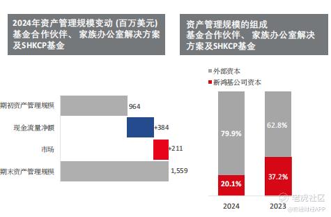 期内,公司的总资产管理规模增长至20亿美元,其中原有业务线(基金合作伙伴、家族办公室解决方案及SHKCP基金)实现有机增长,贡献16亿美元,主要得益于3.84亿美元的净现金流入和2.11亿美元的市场收益。截至2024年底,资产管理规模中外部资本的贡献率提升至79.9%,反映市场对其策略的认可。由于资产管理规模的大幅上升,基金管理业务的费用收益同比增长55.6%;除税前贡献暴增191.7%至4900万元。