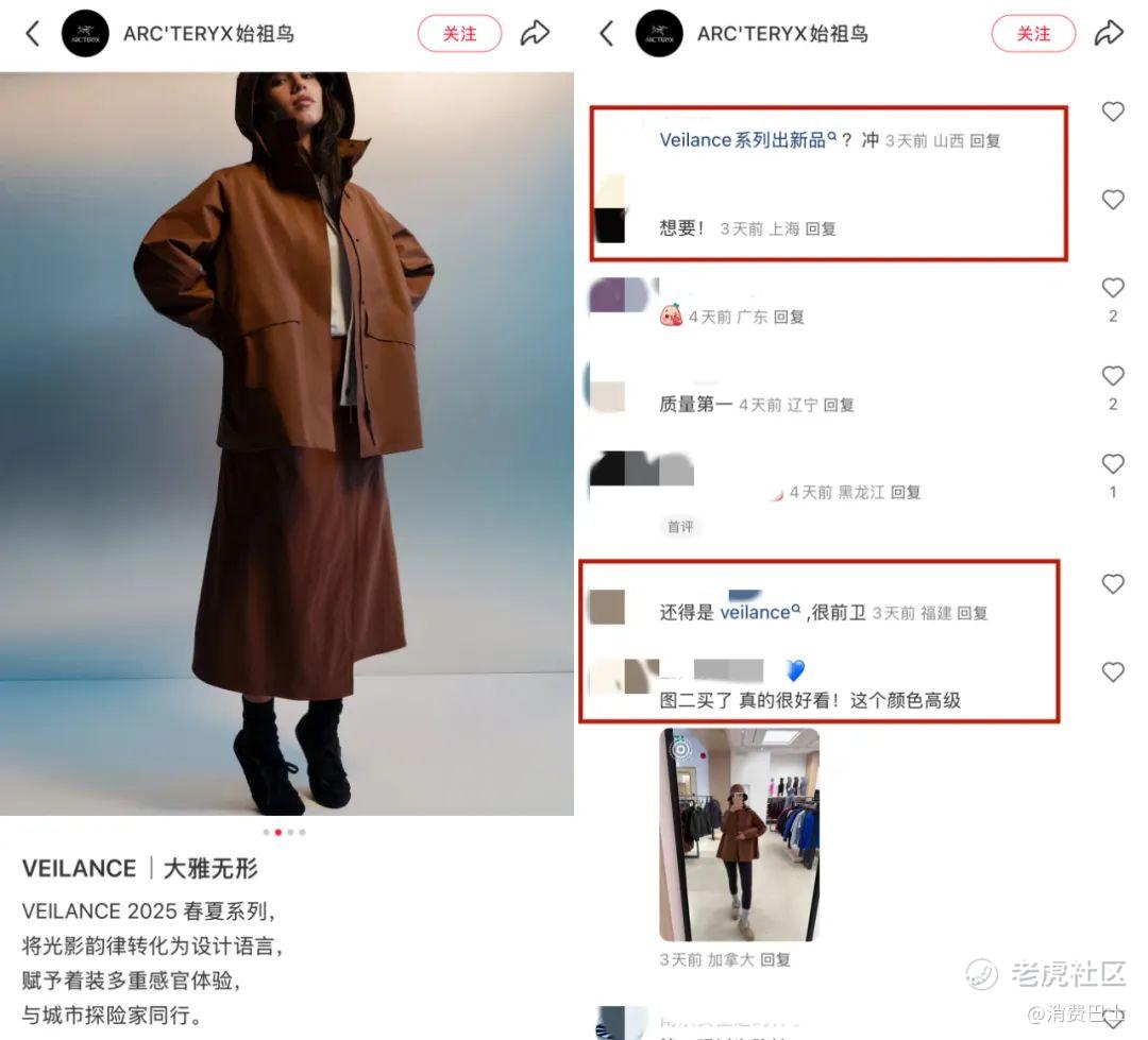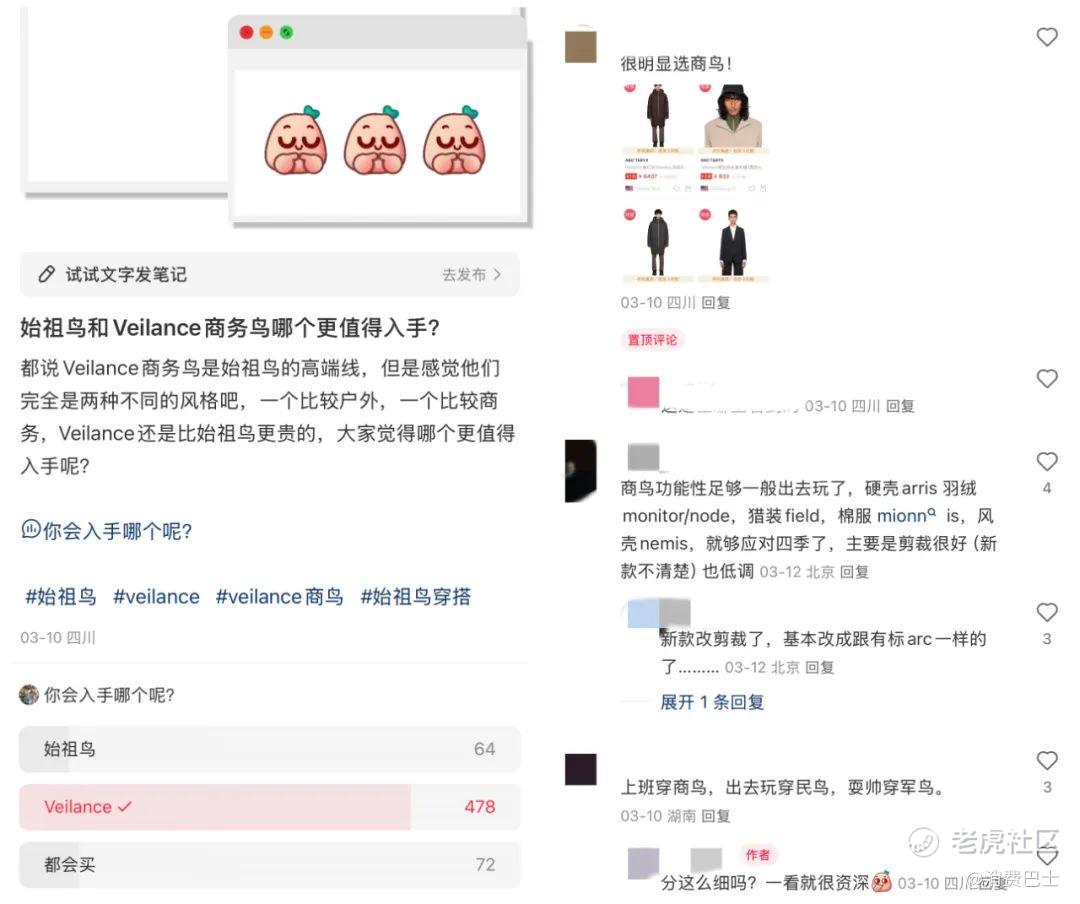 那条小红书下面,有人大喊“冲”、有人说“想要”,还有疑似代购的朋友穿着新品拍照大呼“颜色高级”。而在一个“始祖鸟和Veilance商务鸟哪个更值得入手”的投票下,你甚至感觉不到牛马打工的辛苦和消费降级的存在,毕竟600多个投票里,有78%都选择了更贵的“商鸟”。