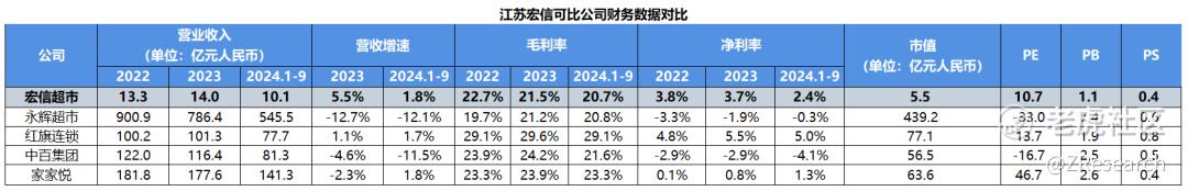 近年来,传统商超行业受消费者购物习惯变化、电商迅速发展等因素的冲击较大,行业整体增长乏力,2024年仅有38.2%的超市企业实现了销售总额的同比增长,多家上市商超企业均处于亏损状态。江苏宏信聚焦苏中地区市场,尽管在营收规模上远不及永辉、红旗等大型商超,但其凭借深耕苏中地区的本地化经营策略,成功构建了较高的品牌忠诚度;于2021年取得中国最大的粮油生产及加工集团之一益海嘉里在扬州的分销权,依托该头部供应商,成为区域粮油食品分销核心节点,2024年前九个月向益海嘉里的采购额占公司采购总额的30.5%,批发业务的收入占比也也因此超越了零售业务的收入占比;在预制菜等新兴领域的布局也为其带来了新的增长点。这些因素共同作用,使其在行业整体承压的背景下,依然能够保持业绩正增长和正利润率。按发行市值中值和2023年财务数据计算,江苏宏信的PE为10.7倍。低于红旗和家家悦,PB为1.1倍。PS为0.4倍,均处于行业低值,估值不贵。
