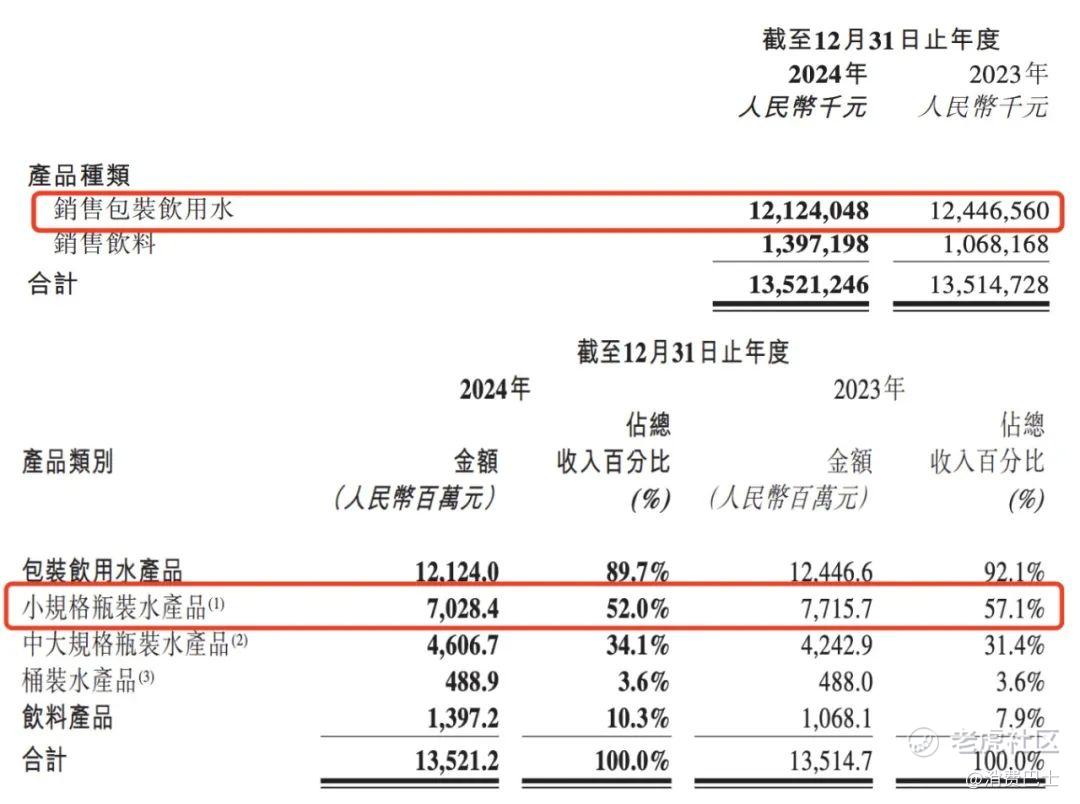 根据怡宝母公司华润饮料24年财报,它的包装饮用水产品零售额同比增长了4.5%,但营收相比23年却下滑了2.6%到121.2亿元,其中它的小规格瓶装水,营收从77亿元下滑到了70亿元,营收占比从57.1%掉到了52%。