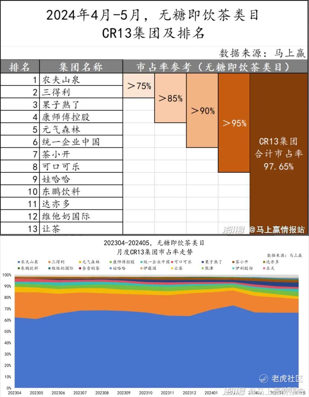 “先头者”的卡位,以及200多万个终端网点,让东方树叶即使在玩家越来越多的无糖茶赛道,也保住了绝对优势。根据快消行业数据分析公司“马上赢”的统计,2023年5月时,东方树叶和三得利的CR2市场份额接近85%,到24年4-5月,这一数据变为超75%。但萎缩的似乎是渠道侧稍显乏力的日资品牌三得利,东方树叶依然有60%+左右的市场份额。