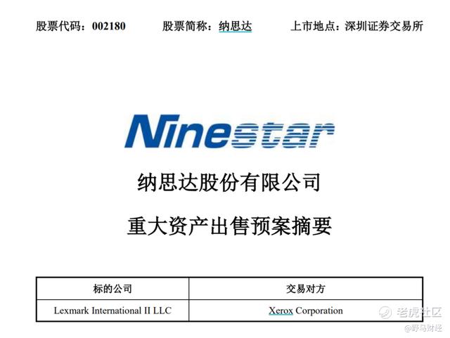 3月26日晚,纳思达发布(002180.SZ) 公告称,公司拟通过开曼子公司II以现金方式将所持的Lexmark International II,LLC的100%股权出售给美国施乐公司。本次交易将实现对利盟国际的整体出售,构成重大资产重组。