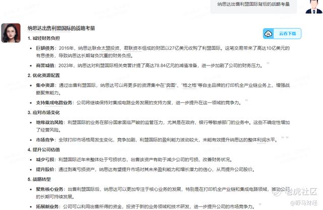 关于这次出售,给纳思达带来的影响,wind金融数据库 AI机器人Alice 称,这笔交易带来了高达10亿美元的有息债务,导致纳思达长期背负沉重的财务负担。利盟国际的业务在部分国家面临严峻的监管压力,尤其是在政府、银行等敏感部门的业务中,这些不确定性增加了经营风险。而且,全球打印市场竞争加剧,利盟国际的盈利能力波动较大,未能有效提升纳思达的整体利润水平。利盟国际近年来整体处于亏损状态,出售该资产有助于减少公司的亏损,改善财务状况。提升市场对其未来盈利能力和增长潜力的信心,从而提升公司股价。而且,通过出售利盟国际,纳思达可以将更多的资源集中在“奔图”、“格之格”等自主品牌的打印机全产业链业务上,增强战略聚焦能力。