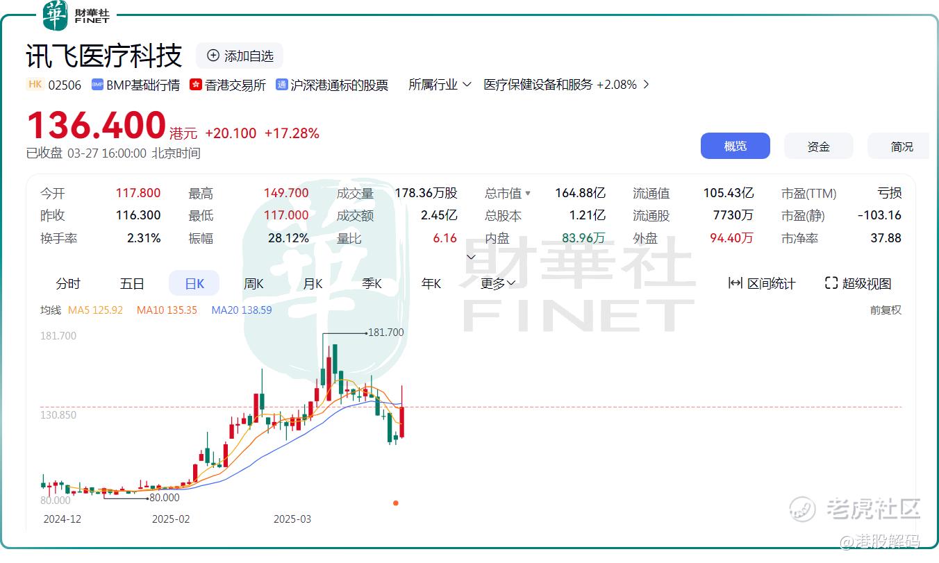 3月27日,有着“医疗模型第一股”之称的讯 $讯飞医疗科技(02506)$ 股价走势强劲。截至收盘,该股放量大涨17.28%,报136.4港元/股。