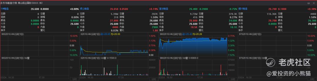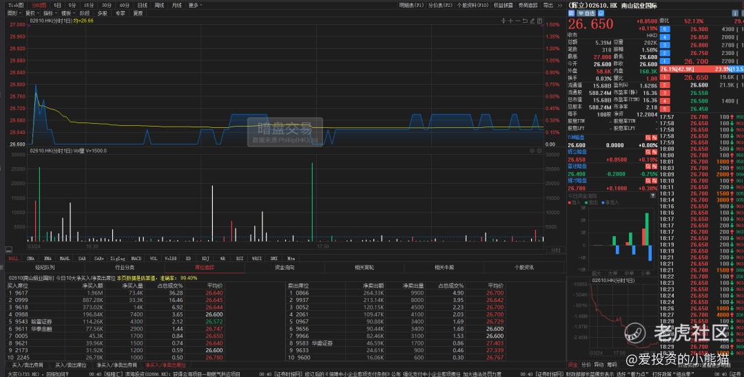 南山铝业国际(02610.HK)辉立暗盘以26.60港元平开,立马上冲最高点27.00港元,又回落到最低点26.60港元后企稳,在26.65港元附近震荡横盘,尾盘以26.65港元报收,涨幅0.19%,振幅1.50%。