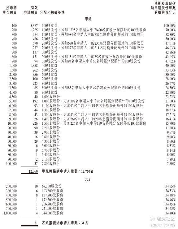 南山铝业国际(02610.HK)的乙组官方披露的中签名单里有10人中签69100股,有6人中签103600股,有8人中签137900股,有1人中签172300股,有1人中签206700股,有1人中签241000股,有4人中签344000股。乙组总共中签337.98万股,货值约8990万港元。