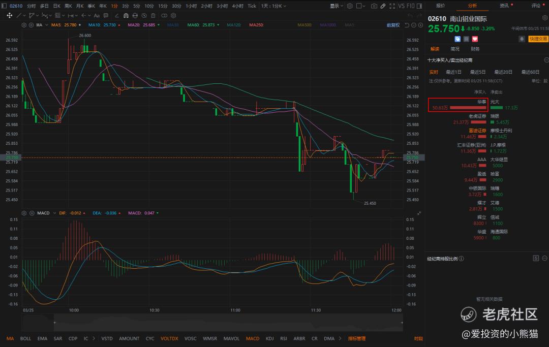 $南山铝业国际(02610)$ 今日上市平开,秒升到26.90港元后,立马回落到26.00港元止跌,再震荡上行,在开盘价位置遇阻再次回落,截止中午收盘价为25.75港元,跌幅3.20%。