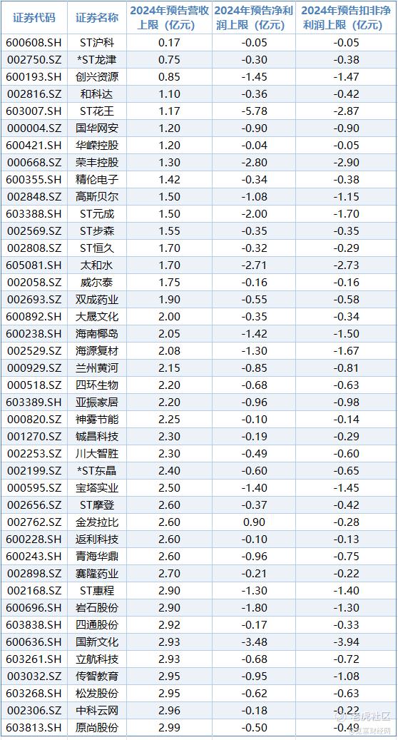 根据各公司2024年年报预告数据,从营收上限来看,ST沪科、*ST龙津、创兴资源等公司去年营收均低于1亿元;从净利润上限来看,ST花王、国新文化、荣丰控股等12家公司去年亏损超亿元;从扣非净利润上限来看,ST花王、国新文化、太和水等13家公司亏损超亿元。