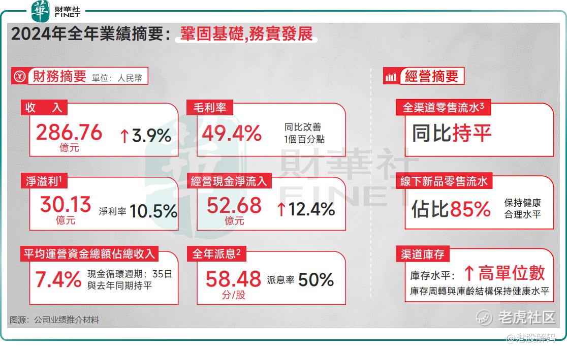 2024年全年,李宁实现收入286.76亿元(单位人民币,下同),同比小幅增长3.9%,超出市场预期;毛利率49.4%,同比改善1个百分点;股东应占溢利30.13亿元,同比下滑5.5%。