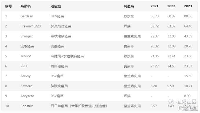 图:2021年-2023年全球TOP10疫苗销售额(亿美元)