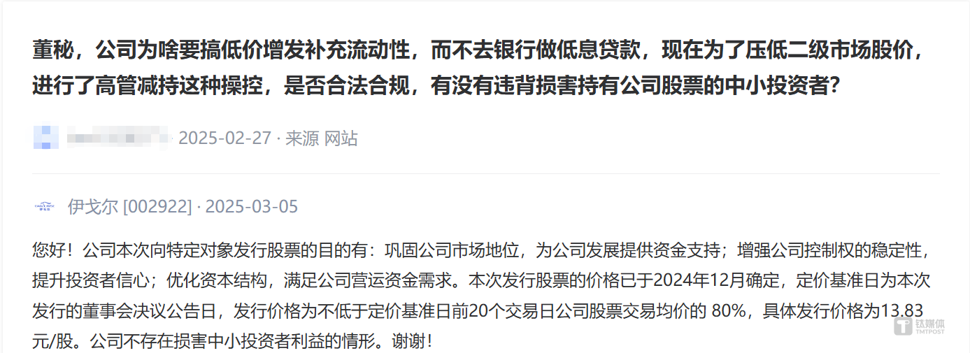 因此,也有投资者在互动平台提问:“公司低价定增补流,为何不考虑银行低息贷款?这是否存在损害中小投资者利益的行为?”