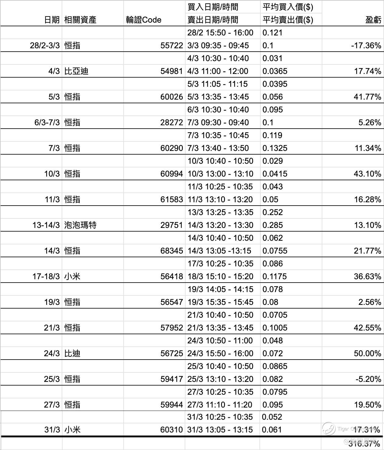 全月综合计算为316.37%正数收入,与以往稍有不同,是本月比较多个股轮证的交易,而从个股方面亦见得到的回报亦比 $HSI(HSI)$ ,市静向向个股方向亦不失为一个「解闷方法」。