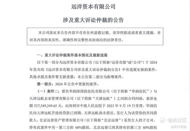 具体来看,其中一起诉讼案涉金额约5.27亿元,具体缘由为华润信托向天津远屹企业管理有限公司(以下简称“天津远屹”)发放的贷款已到期,而天津远屹尚未偿还,远洋资本为该笔贷款的共同借款人。