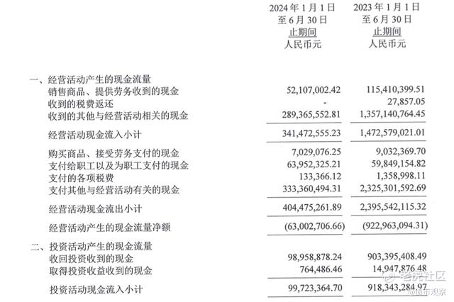 2024年上半年,远洋资本经营活动产生的现金流净额由2023年同期的-9.23亿元收窄至-6300.27万元;投资活动产生的现金流净额由2023年同期的8.88亿元减少至6809.18万元;筹资活动产生的现金流净额为0,2023年同期为-886.18万元。