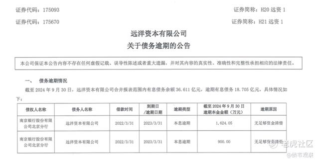 截至2024年9月30日,远洋资本合并报表有息负债为36.61亿元,逾期有息负债达18.7亿元,逾期原因均为“无足够资金清偿”。