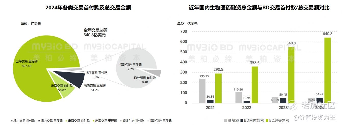 2024年,中国医药BD(指企业通过授权、合作开发、合资等方式,与其他企业或机构达成战略性资源整合,核心目标是推动创新药研发、市场拓展及资金回笼)交易总额为640.8亿美元创历史新高,主要贡献为出海交易共577.5亿美元,其中首付款50.7亿美元: